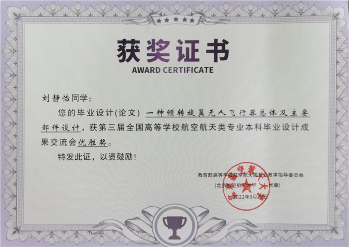 近日,在第三届全国高等学校航空航天类专业本科毕业设计成果交流会中,由我校yL23411永利官网登录教授李文辉指导、2022届本科毕业生刘静怡完成的毕业设计(论文)喜获优胜奖。这是学院自2019年底成立以来,培养的第一批本科毕业生首次参赛即获得此项荣誉,是在本科教育教学和人才培养方面取得的重大突破。