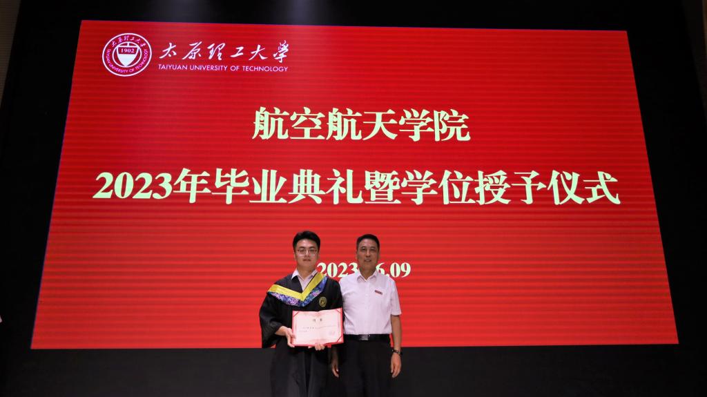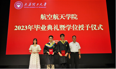 仪式上,党委书记王银兵为获得2023届优秀毕业生荣誉的冀彦哲、褚发两位同学颁发证书、为学院校友分会2023届毕业生年级理事冀彦哲颁发聘书,并分别与他们合影留念。
