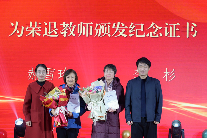 伴随着不舍与祝福,联欢会上,向为学院建设发展做出贡献而今荣退的郝雪玲、李杉两位老师颁发了荣退证书,青年教师代表向两位老教师献花。
