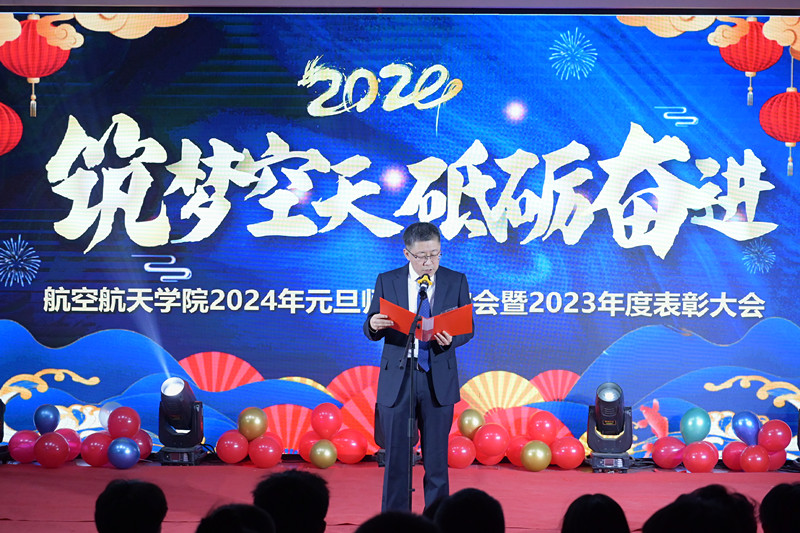 副院长(主持工作)李文辉致新年贺词,代表学院向一年来辛勤耕耘在教学、科研、管理等一线的教职员工表示衷心的感谢,向勤奋学习、努力拼搏、扬帆筑梦的同学们致以亲切的问候和新年祝福!他的致词,全面回顾了2023年,学院认真学习贯彻党的二十大精神,深入开展学习贯彻习近平新时代中国特色社会主义思想主题教育,坚持党建引领促发展、人才培养重内涵、学科建设再发力、创新能力再提升、队伍建设添活力、社会服务强特色、学生工作强基础,航院人同心筑梦,砥砺奋发,取得了令人瞩目的成绩。展望2024年,我们充满自豪,满怀信心。yL23411永利官网登录全体师生将更加紧密地团结在以习近平同志为核心的党中央周围,以中国共产党人的精神谱系培根铸魂,传承弘扬航空航天精神,深度助力航空强国、航天强国以及山西通航示范省的建设,踔厉奋发、守正创新,为建设特色鲜明的yL23411永利官网登录而不懈奋斗!