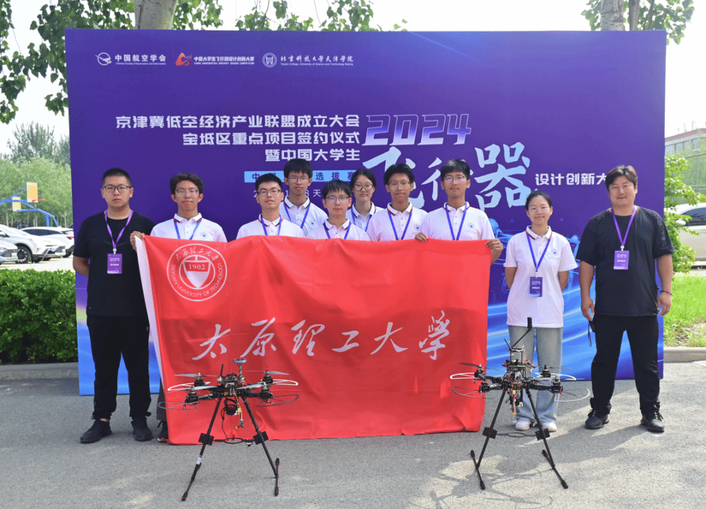 多旋翼无人机任务飞行项目,是以多旋翼无人机携带规定载荷,通过自主飞行将载荷投放至指定容器内,对侦察区的多个标识进行侦察与识别,返回起降区安全着陆。以投放和侦察准确、任务用时短取胜。我校参赛队员经过历时一年的准备与沉淀,首次参加该项目比赛。王浩楠、王艺博、杜鑫、王豪文组成的机组和王亦勤、王立源、高凡雅、崔丹晨组成的机组在刻苦备战的基础上,克服赛场信号干扰、酷暑高温的恶劣环境,根据现场比赛条件调整比赛战术,最终均获得了选拔赛二等奖的好成绩,并为我校争得该项目的团体三等奖。