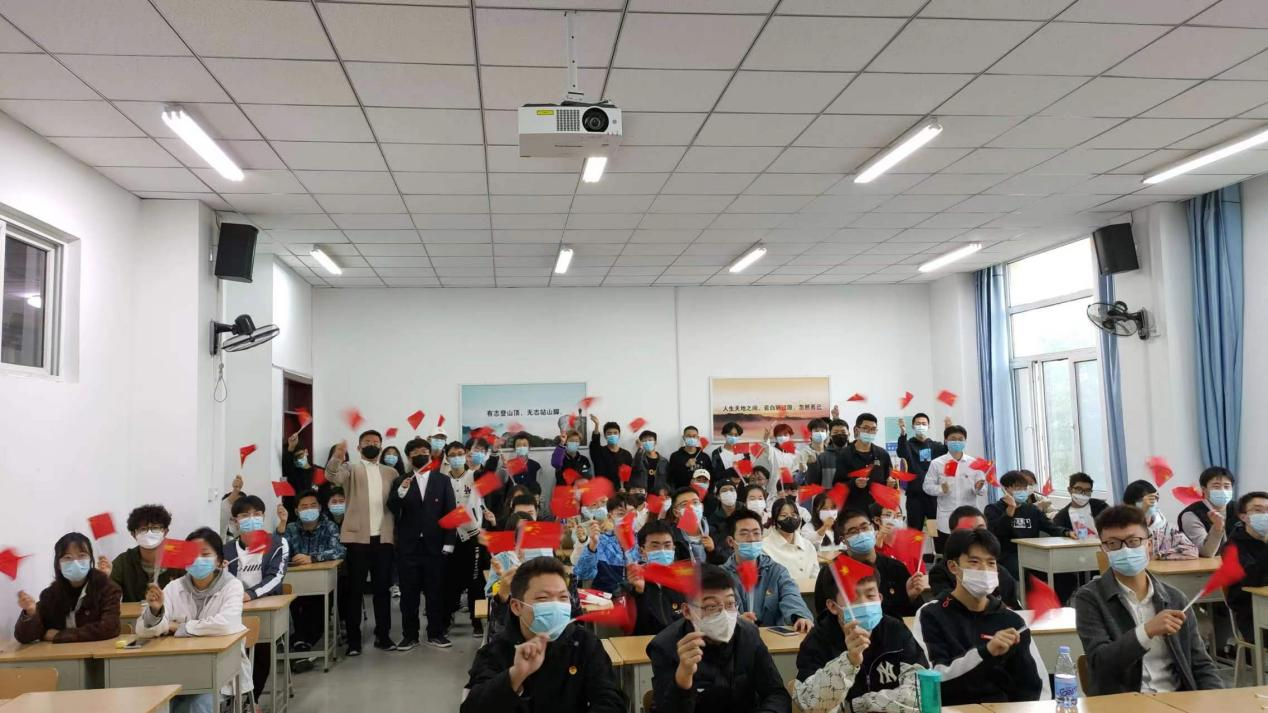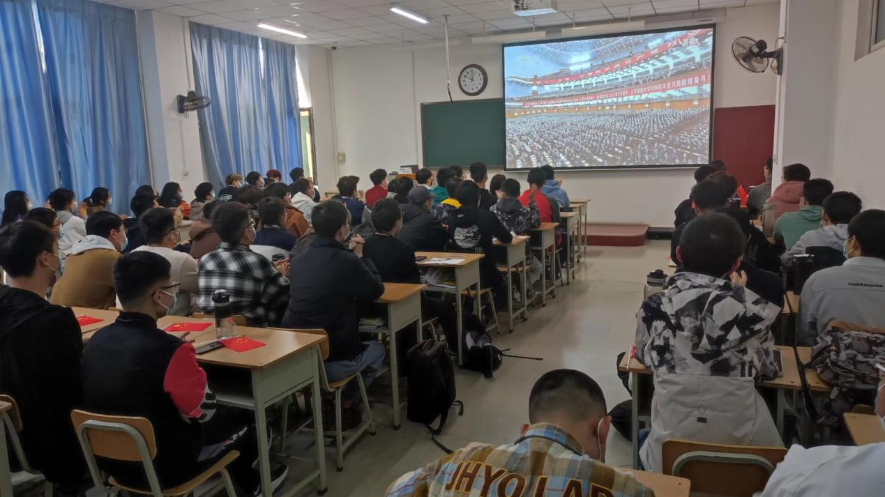 习近平总书记代表第十九届中央委员会向大会做了“高举中国特色社会主义伟大旗帜,全面贯彻新时代中国特色社会主义思想,弘扬伟大建党精神,自信自强、守正创新,踔厉奋发、勇毅前行,为全面建设社会主义现代化国家、全面推进中华民族伟大复兴而团结奋斗”的报告。整个过程中,同学们手持国旗,佩戴党徽、团徽,认真聆听,并不时报以热烈的掌声。