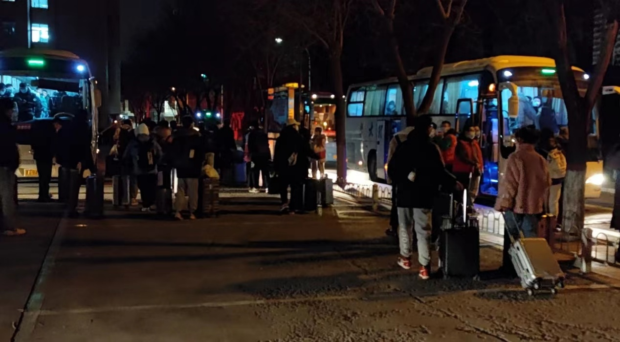 凌晨5点,零下十度的天气,寒风凌冽,平日静谧的校园,早已灯火通明。返乡学子们归心似箭,热心的志愿者们热情服务,广场上的大巴车整装待发,大家在志愿者们的引导下,有序登车,并提交自己的离校申请,领取学校提前准备的“爱心N95”,寒风虽厉,心底颇暖。