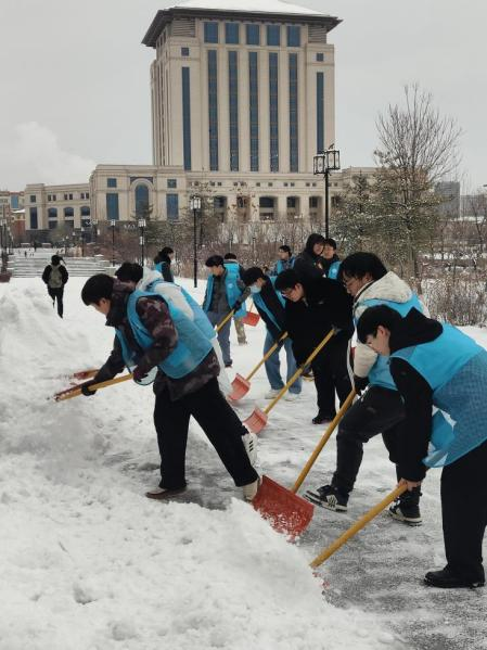 学生党员、学生干部和团学组织学生纷纷主动请缨,拿起铁锹、扫帚,组成了扫雪突击队,对学院楼前、图书馆至内环南路的明向西路段的积雪进行了清扫。